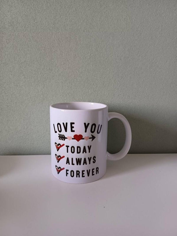 De keramische mok heeft een wit glanzend oppervlak. De diameter is ong. 80 mm en de hoogte ong. 96 mm.